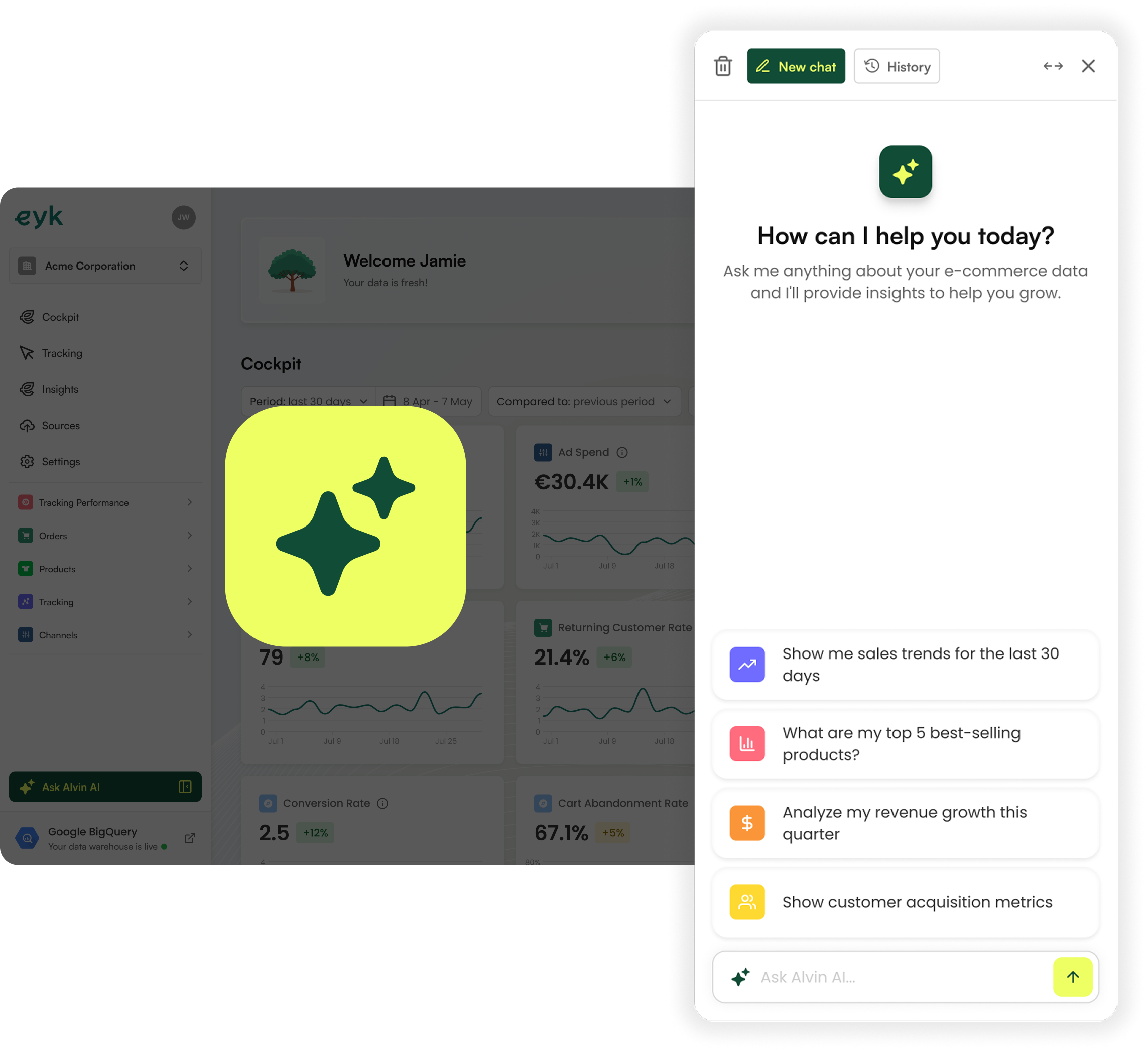 Alvin AI is connected to your order data, your spend across channels and your first-party tracking events. Along with Eyk's reliable data structure and semantic layer, Alvin has everything to help you uncover your most profitable growth opportunities.